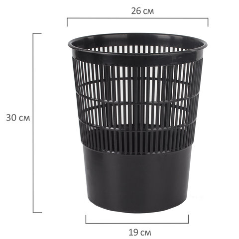 Изготовлена из высококачественного пластика черного цвета. Благодаря объему 14 литров способна вместить большое количество мусора. Корпус расширяется к верху: диаметр основания составляет 19 см, а диаметр верхней части - 26 см. Высота - 30 см. Легкость и компактность корзины позволяют перемещать её с одного места на другое. Корзина удобно помещается под рабочим столом. Рекомендуемый размер мешка для мусора - 45х57 см, объем - до 30 литров.
