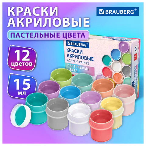 Краски акриловые ПАСТЕЛЬНЫЕ для рисования и творчества 9 цветов по 15 мл, BRAUBERG, 192693