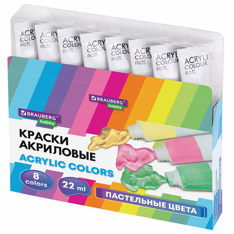 Краски акриловые BRAUBERG HOBBY – универсальный рабочий материал для широкой гаммы увлечений. Подходят для живописных и декоративно-оформительских работ на большинстве поверхностей (бумага, картон, грунтованный холст, дерево и др.).