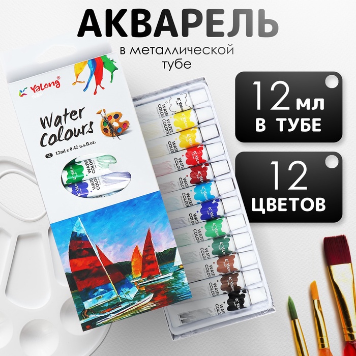 Краски акварельные 12 цветов в металл тубе 12 мл в картонной коробке