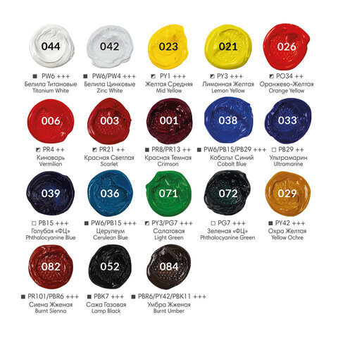 Краска имеет 5 степеней затирки пигмента. Вязкая текстура краски обеспечивает сохранение ее эластичности в течение длительного времени. Все краски легко смешиваются между собой. Объем тубы - 22 мл.