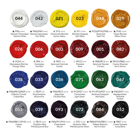 Краска имеет 5 степеней затирки пигмента. Вязкая текстура краски обеспечивает сохранение ее эластичности в течение длительного времени. Все краски легко смешиваются между собой. Объем тубы - 12 мл.