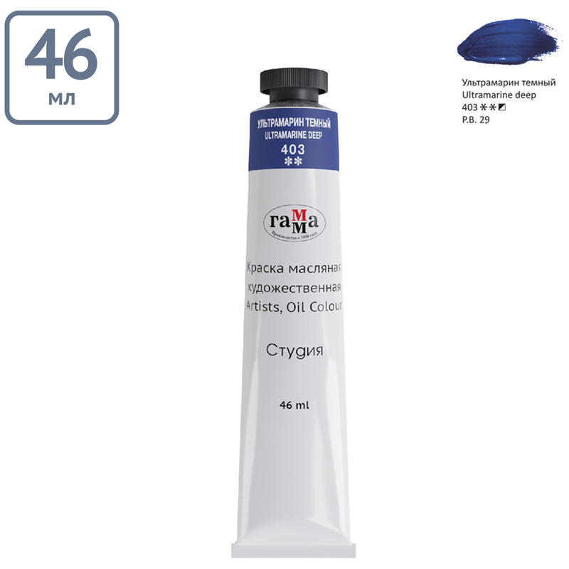 Масляные краски "Гамма" серии "Студия" изготавливаются из льняного масла, органических и неорганических пигментов. Кадмиево- кобальтовая группа заменена имитацией, что делает краски безопасными. Также в состав красок входит пчелиный воск, он придает краскам пастозную консистенцию и предотвращает от растрескивания после высыхания. Цветовой диапазон включает в себя как укрывистые краски, так и прозрачные. Масляные краски подходят для обучения и начинающих художников.