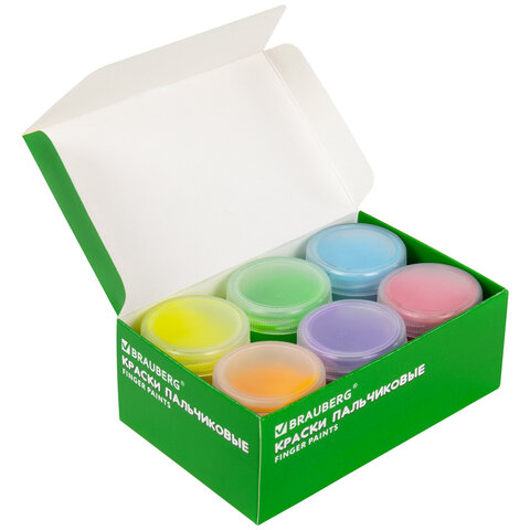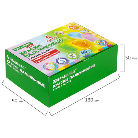 Пальчиковые краски подходят для рисования по бумаге, картону, дереву, керамике, кафелю и другим поверхностям. Легко смываются с рук, без труда отстирываются с одежды. Натуральные природные красители в составе могут незначительно окрашивать некоторые поверхности. Краски упакованы в пластмассовые герметичные баночки объемом 40 мл. Общий объем – 240 мл.