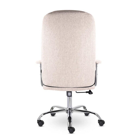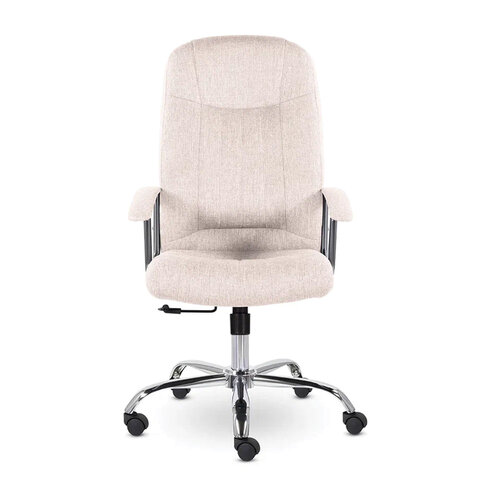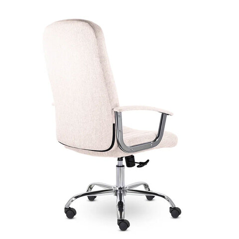 Кресло с мягкими увеличенными подушками. Широкая эргономичная спинка имеет две горизонтальные прострочки, которые отделяют подголовник от основной части спинки. Благодаря глубокому сиденью, в кресле будет удобно человеку среднего и высокого роста. Длинные хромированные подлокотники способствуют комфортной посадке в кресле.