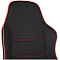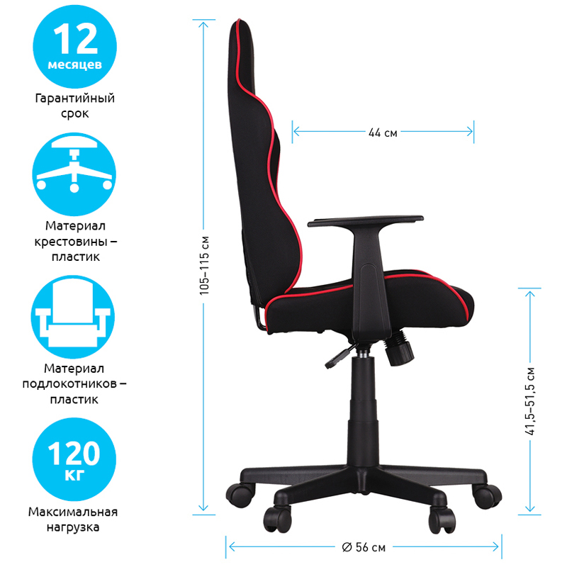 Максимальная нагрузка составляет 120 кг. Газпатрон 3 класса по стандарту BIFMA X5.1. Каркас – немонолитный, материал набивки – вспененный полиуретан, крестовина – пластиковая, подлокотники – пластиковые, материал обивки – ткань чёрного цвета с красными вставками. Механизм качания с возможностью фиксации кресла в рабочем положении. Гарантийный срок – 12 месяцев.