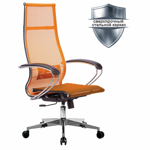 Кресло офисное МЕТТА "К-7" хром, прочная сетка, сиденье и спинка регулируемые, оранжевое