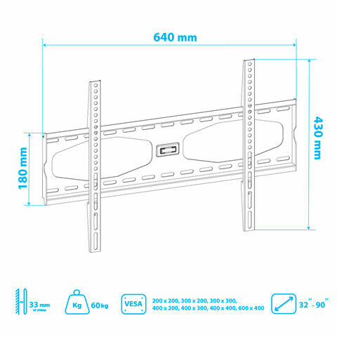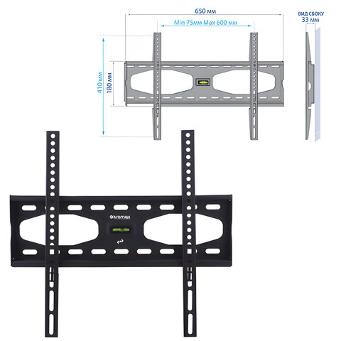 Настенный кронштейн для ЖК (LCD) телевизоров и плазменных панелей с расстоянием от стены 33 мм. Максимальные посадочные отверстия по горизонтали - 600 мм, по вертикали - 400 мм. Встроенный водяной уровень обеспечивает идеально ровное размещение.