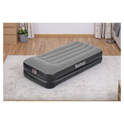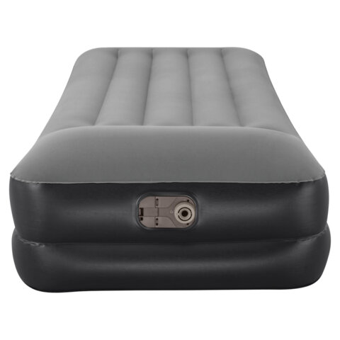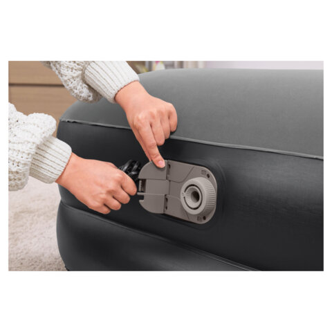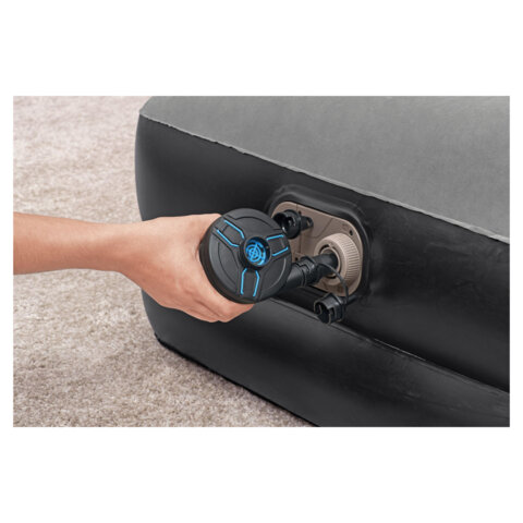 Кровать имеет надежный встроенный электронасос, который позволяет за несколько минут надувать и сдувать кровать, а также дает возможность отрегулировать ее упругость. Насос подключается к стандартной электрической розетке. При отсутствии электричества, кровать можно накачать обычным механическим насосом. Для этого кровать снабжена специальным клапаном для подключения внешнего насоса.
