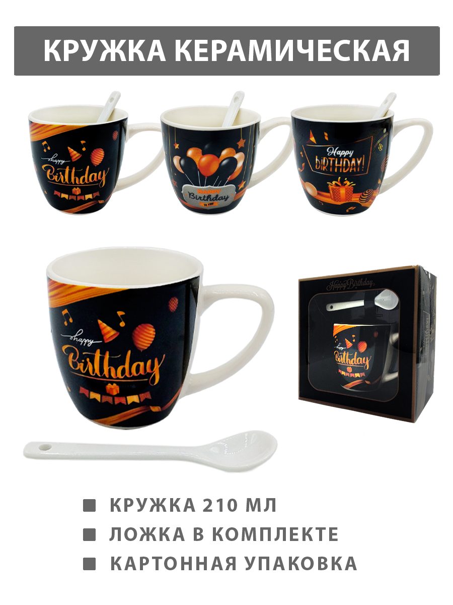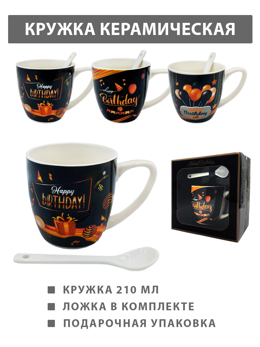 Кружка керамическая подарочная " KWELT " 210мл, Happy Birthday, ложка в комплекте, ассорти (без возможности выбора дизайна), картонная упаковка