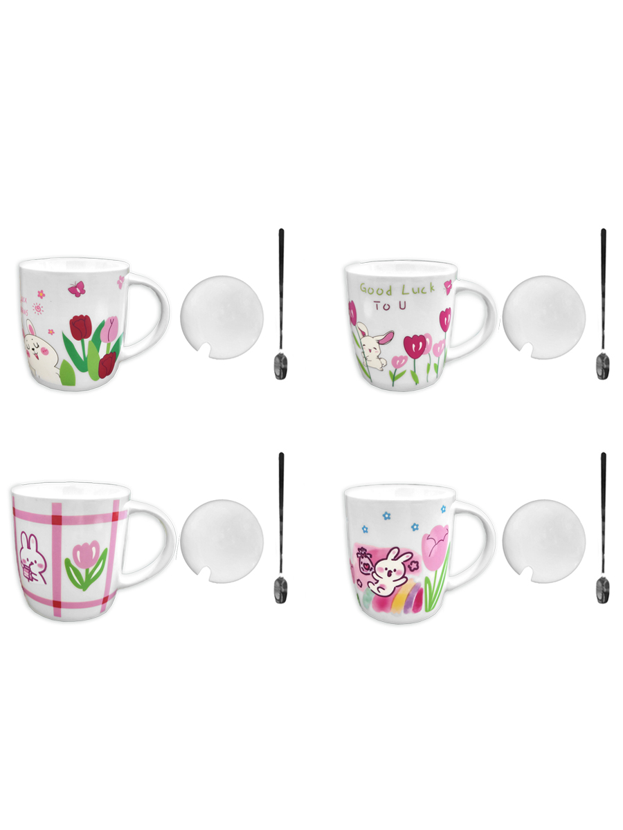 Кружка керамическая " KWELT " 350мл, Rabbit, крышка и ложка в комплекте, ассорти (без возможности выбора дизайна), картонная упаковка