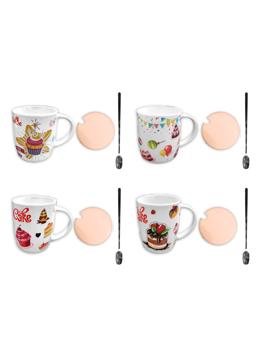 Кружка керамическая " KWELT " 350мл, Cake, крышка и ложка в комплекте, ассорти (без возможности выбора дизайна), картонная упаковка