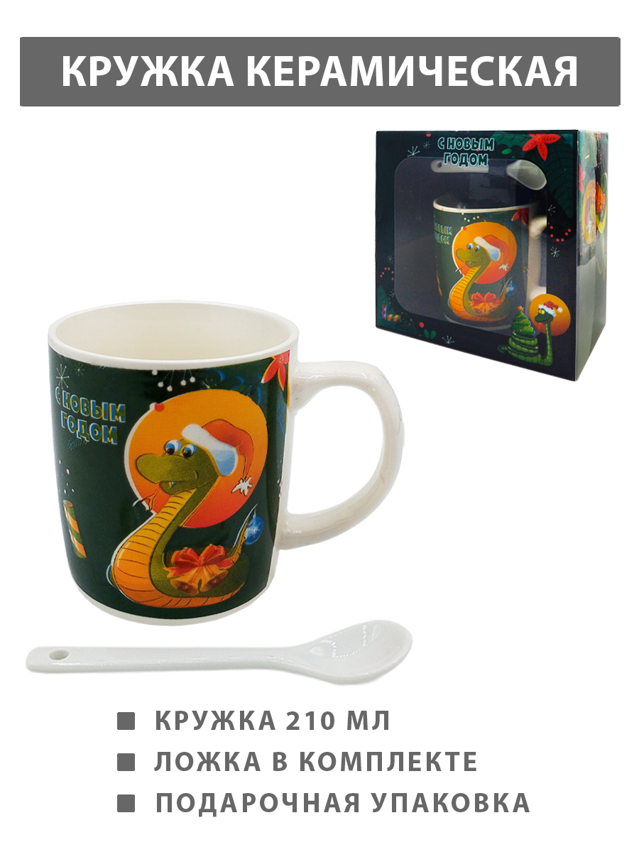 Кружка керамическая " KWELT " 210мл, С Новым Годом! Змея в новогодней шапке, ложка в комплекте, картонная упаковка