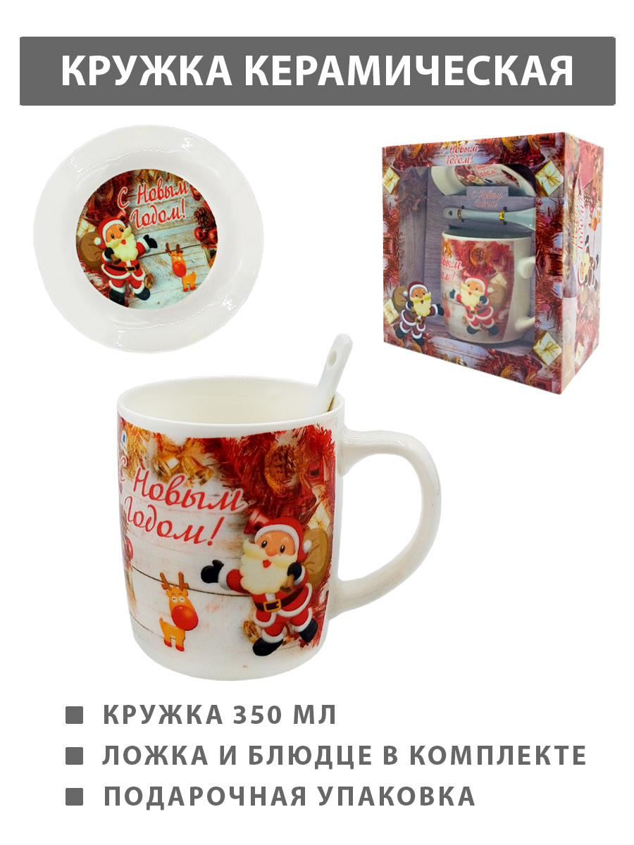 Кружка керамическая подарочная " KWELT " 350мл, С Новым Годом! Санта Клаус, ложка и блюдце в комплекте, картонная упаковка