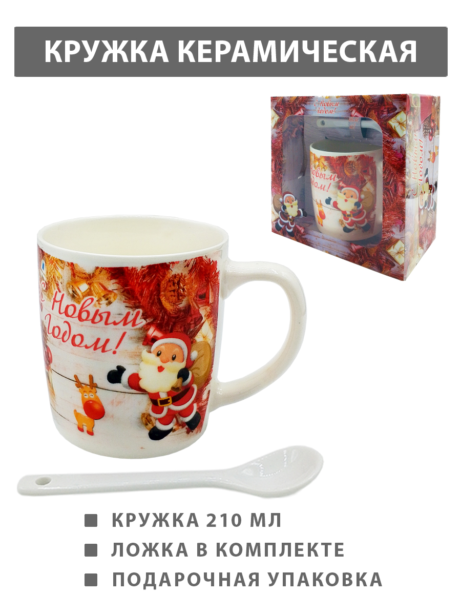 Кружка керамическая подарочная " KWELT " 210мл, С Новым Годом! Санта Клаус, ложка в комплекте, картонная упаковка