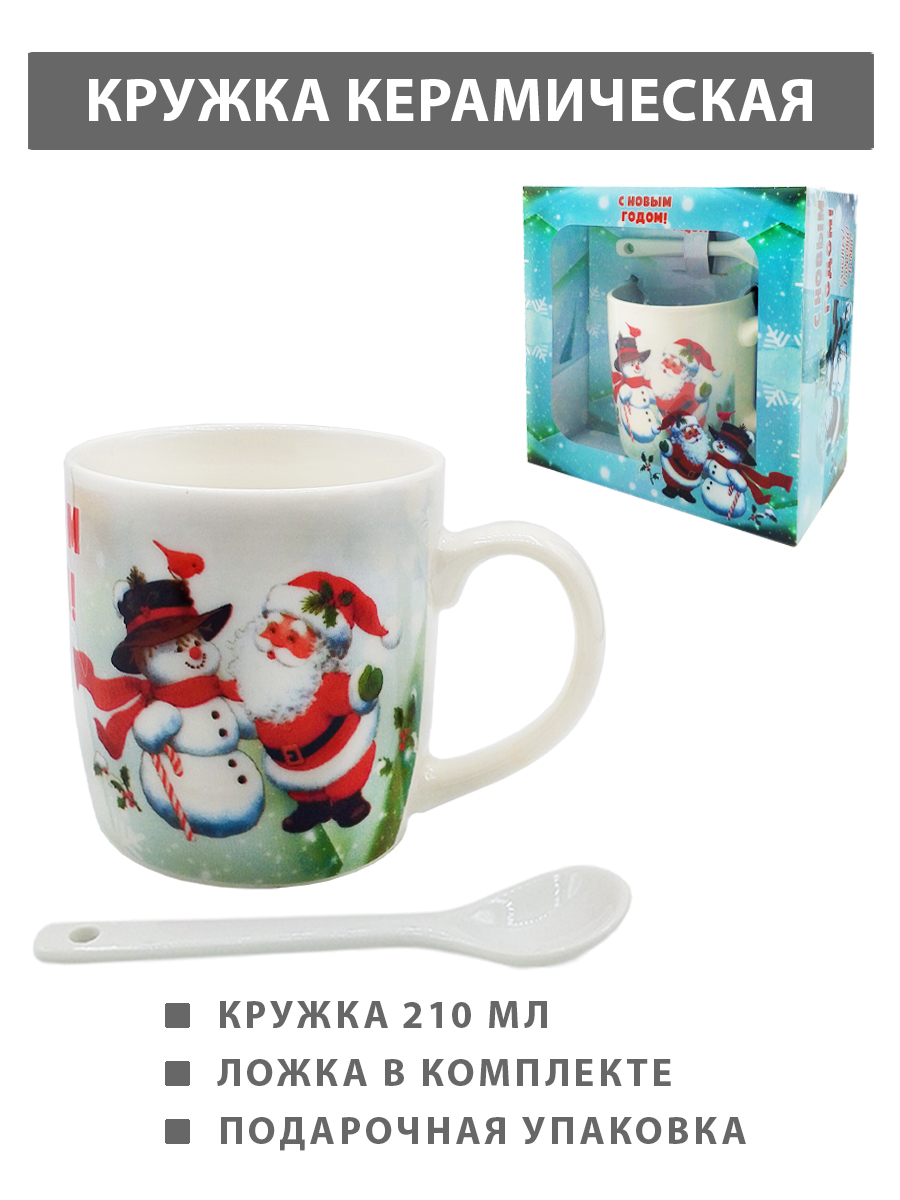 Кружка керамическая подарочная " KWELT " 210мл, С Новым Годом! Санта Клаус и снеговик, ложка в комплекте, картонная упаковка