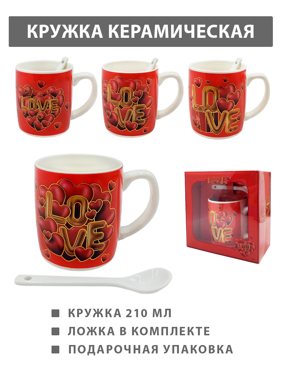Кружка керамическая " KWELT " 210мл, Love, ложка в комплекте, ассорти (без возможности выбора дизайна), картонная упаковка