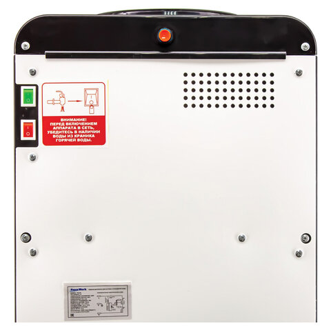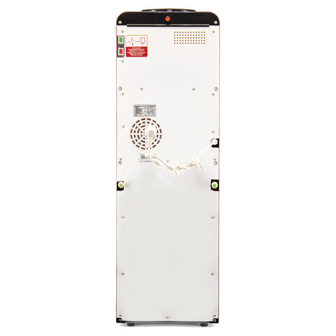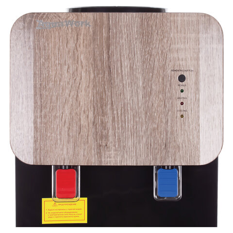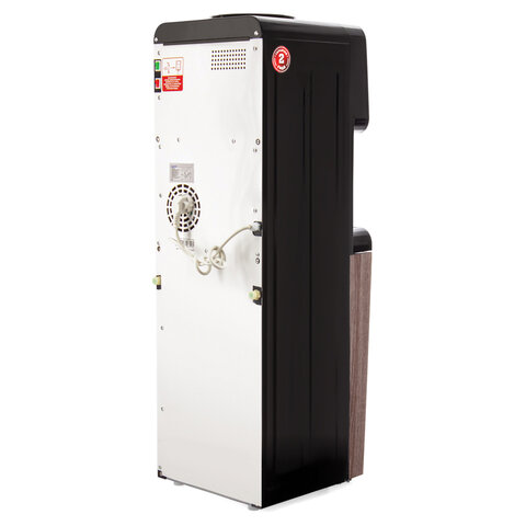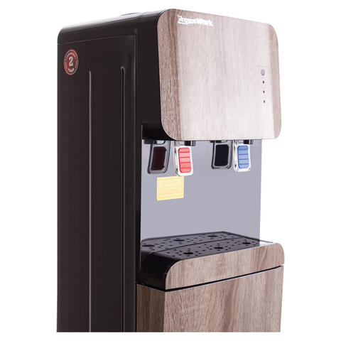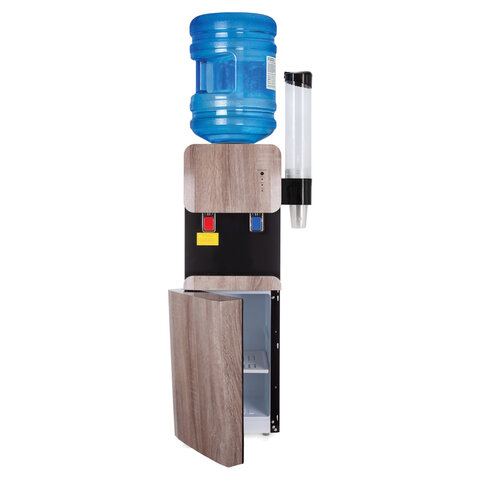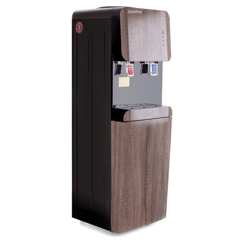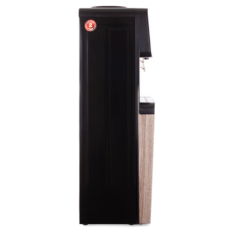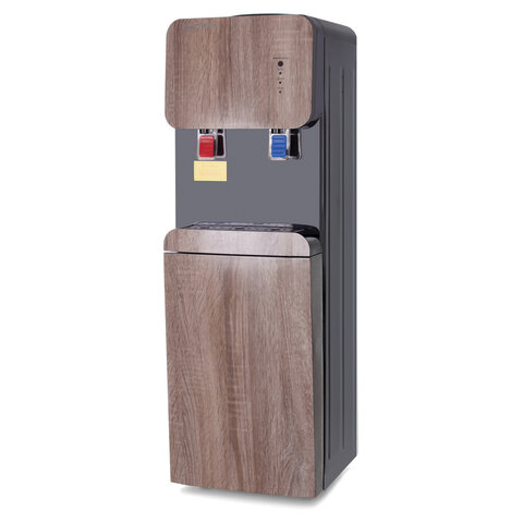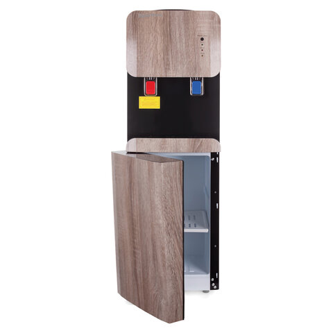 Устройство имеет 2 крана типа "нажим кружкой", а также режим принудительного нагрева, позволяющий получить воду до 95–97°C при необходимости. В нижней части корпуса расположен встроенный шкафчик объёмом 13 литров, где можно хранить чай, сахар, одноразовые стаканы и другие мелкие предметы. Это делает кулер универсальным и удобным в повседневном использовании.
