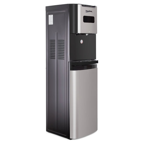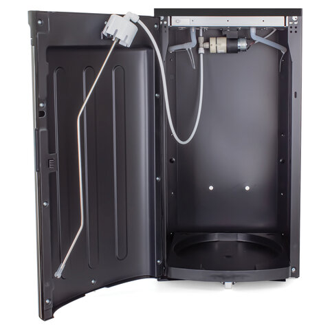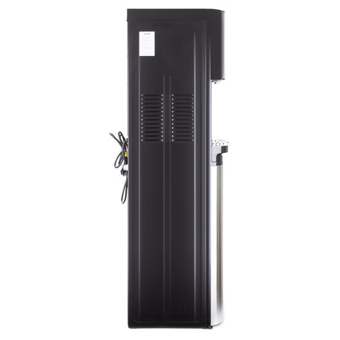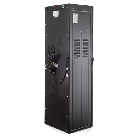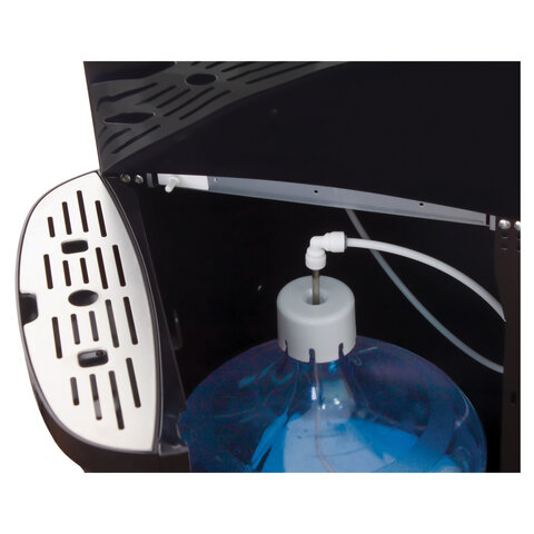 Чёрный корпус с серебристыми вставками выглядит современно и легко вписывается в любой интерьер. Установка бутыли производится снизу, что делает процесс более аккуратным и удобным. Благодаря металлическому каркасу конструкция прочная и долговечная.