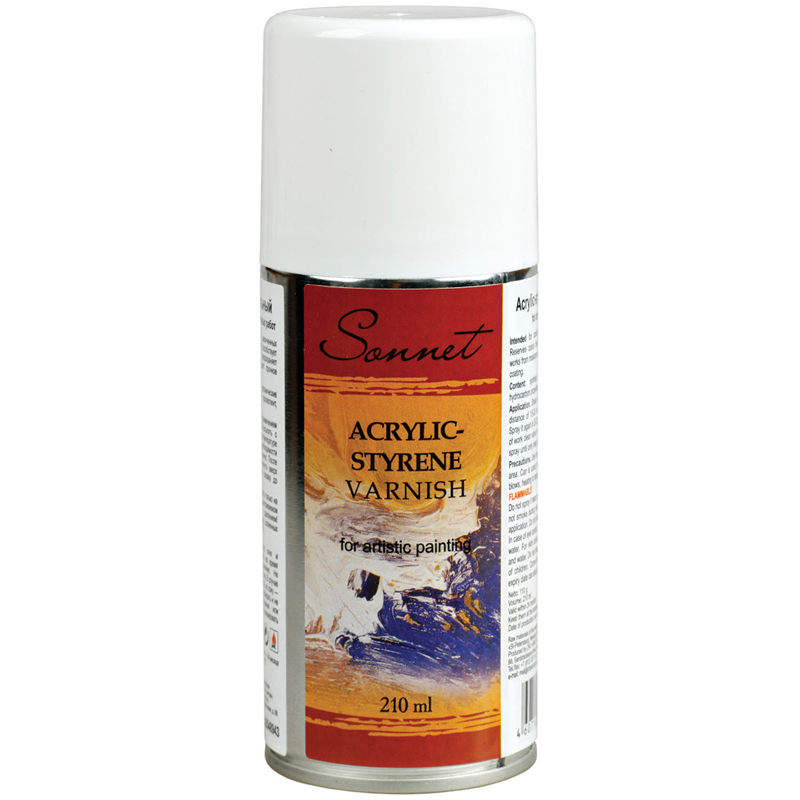 Лак акрил-стирольный для художественно-живописных работ Сонет. Предназначен для покрытия законченных произведений масляной живописи. Способствует сохранению яркости цвета, предохраняет живопись от влаги и пыли. Дает прочное бесцветное покрытие. Состав: синтетические смолы, органические растворители, углеводородный пропеллент, пластификаторы, масла. Способ применения: Перед применением баллон интенсивно встряхнуть. Распылять с расcтояния 15-20 см. Применять при температуре не ниже +15С. В случае необходимости обработку повторить через 20 - 25 минут. После окончания работы баллон перевернуть вверх дном и продуть распылительную головку до прекращения выхода лака. Меры предосторожности: Применять только на открытом воздухе или в хорошо проветриваемом помещении. Баллон под давлением! Предохранять от действия прямых солнечных лучей, ударов и нагрева выше + 50 С. ОГНЕОПАСНО! Не распылять вблизи открытого огня и раскалённых предметов, не курить во время работы. Использовать по назначению. Не допускать попадания в глаза и на кожу. В случае попадания в глаза -- промыть водой, на кожу -- смыть тёплой водой с мылом. Не разбирать и не давать детям! После использования или истечения срока годности баллон утилизировать как бытовой отход. Масса нетто: 110 г. Дата изготовления: на дне баллона; объём баллона: 210 мл. Хранить при температуре от -20С до +50С