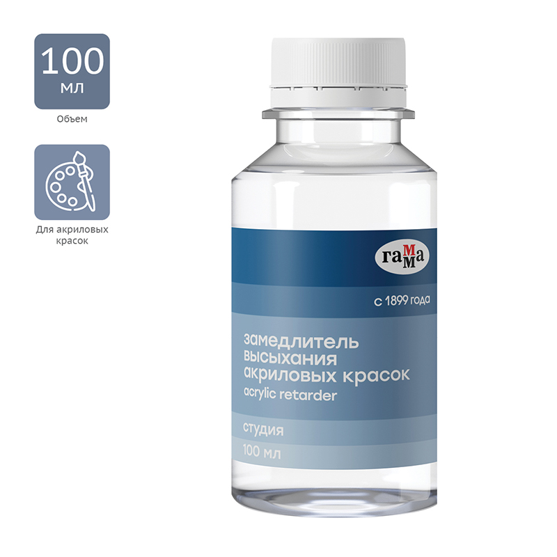 Замедлитель высыхания акриловых красок, 100 мл.<br/>Предназначен для увеличения времени работы с акриловыми красками и замедления высыхания пленки красочного слоя. При смешивании с акриловыми красками не изменяет их основные характеристики, улучшает разносимость. Рекомендуем смешивать с краской на палитре с помощью мастихина или кисти в количестве 1-2 части замедлителя на 10 частей краски.