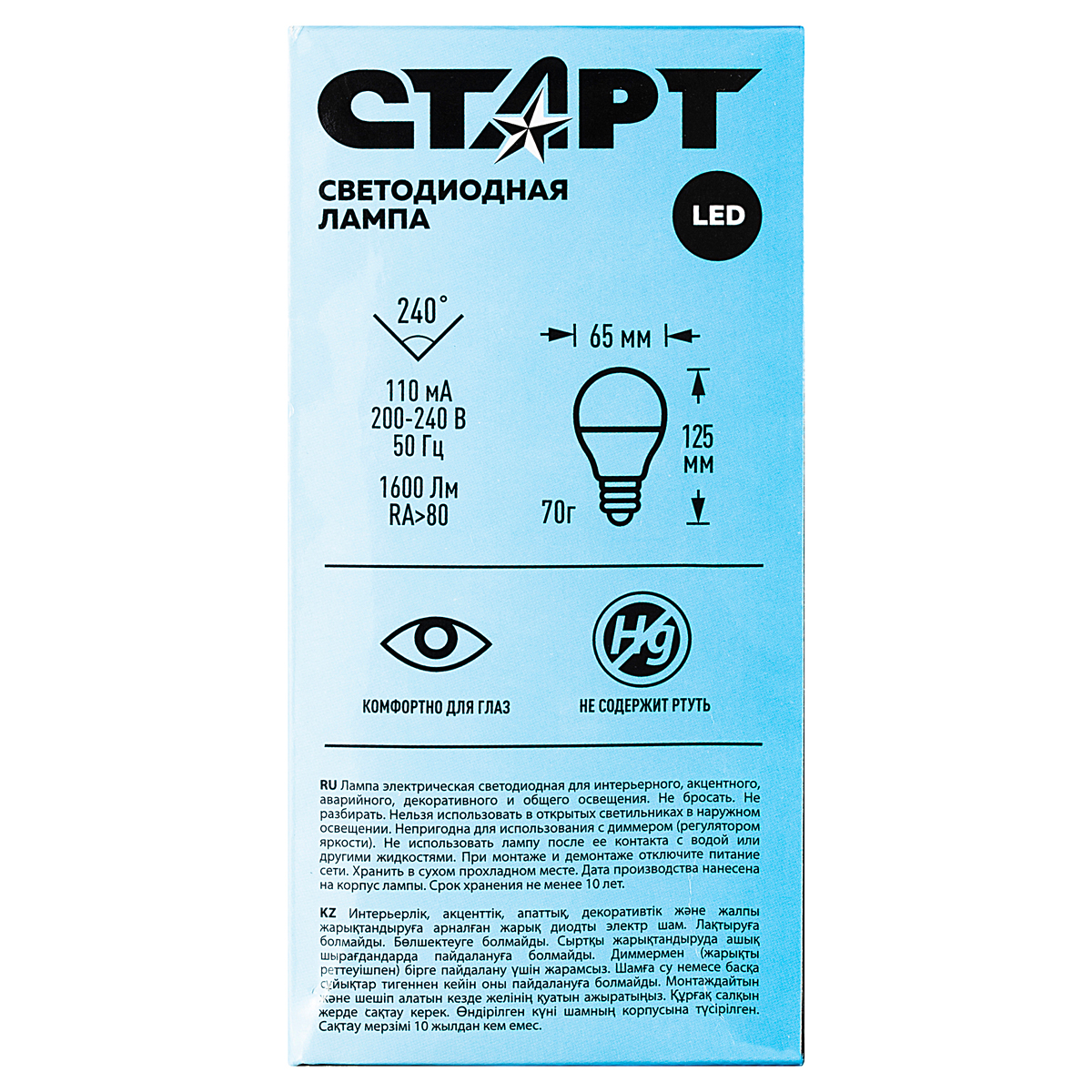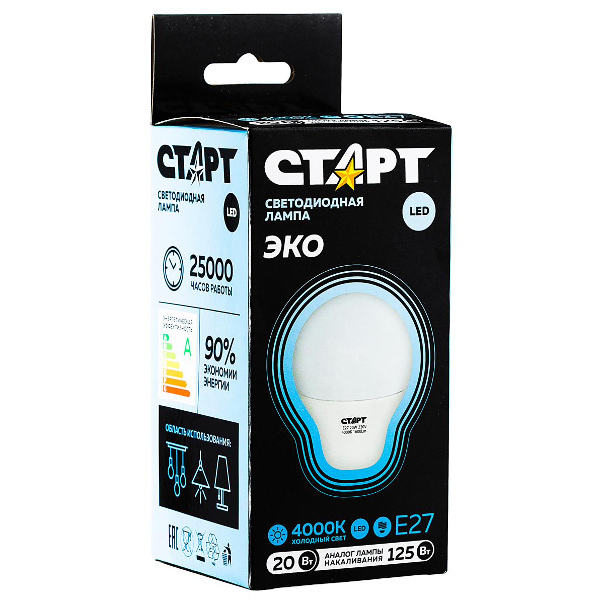 Светодиодная лампа СТАРТиспользуется для освещения различных помещений и является наиболее эффективной лампой среди цокольных аналогов. Благодаря герметичности она может быть использована в качестве источника света в уличныхосветительных приборах. Рассчитана на мощное освещение при низких энергозатратах.<br/><br/>Эстетика и удобство использования<br/><br/>Лампа комплектуется пластиковой колбой и не боится падения и встрясок. Водонепроницаемость корпуса позволяет использовать данный источник света в помещениях с повышенной влажностью и различными температурными показателями. <br/>Матовый рассеиватель дает равномерное покрытие освещаемой площади, заполняя пространство естественным белым светом на уровне 4000К.<br/><br/>Экономия<br/><br/>Элемент освещения способен бесперебойно работать на протяжении рекордных 25 000 часов. Лампа соответствует аналогам мощностью 125Вт, при этом мощность самой светодиодной лампы составляет 20 Вт.Низкое энергопотребление и высокие показатели эффективности делают лампу экономичным источником света. <br/><br/>Безопасность<br/><br/>Корпус произведен из экологически чистых материалов, безопасен для эксплуатации в жилых помещениях. Светодиодный источник освещения оборудован защитой от перегрева и перепадов напряжения. Лампа не излучает УФ- и ИК-лучи в процессе свечения.