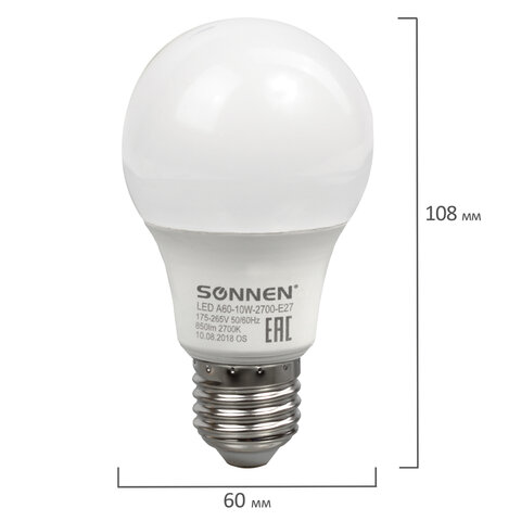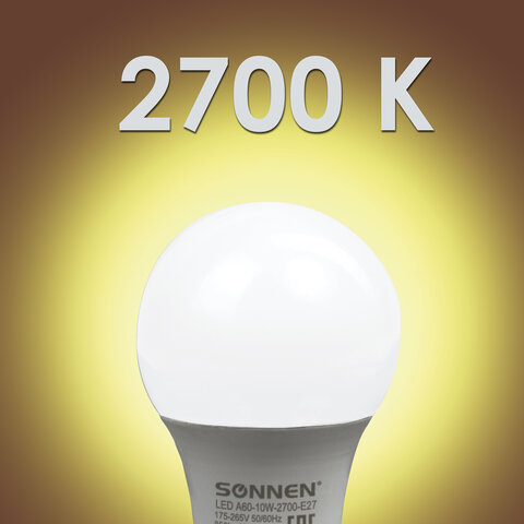 Оснащена цоколем типа Е27 и излучает теплый белый цвет. Отличается длительным сроком службы. Имеет грушевидную форму колбы и сделана из белого матового пластика. Мощность лампы составляет 10 Вт. Представленная модель дает световой поток 850 Лм нейтрального спектра, цветовая температура которого равна 2700 K. Диаметр лампы составляет 60 мм.