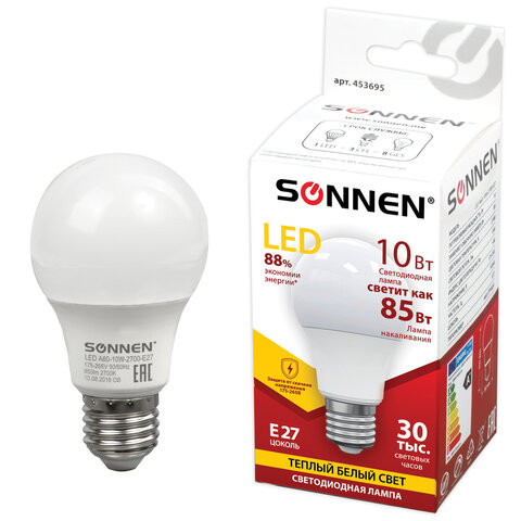 Светодиодная лампа SONNEN компактного размера. Срок службы лампы составляет не менее 30000 часов, что примерно в 30 раз больше, чем у обычной лампы накаливания.