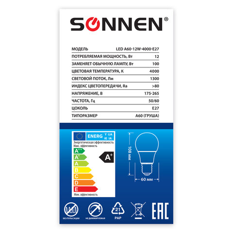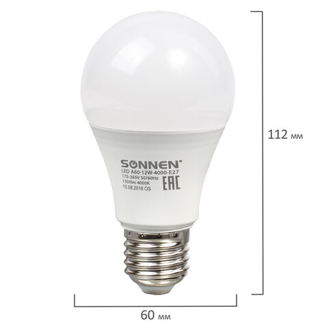 Оснащена цоколем типа Е27 и излучает нейтральный белый цвет. Отличается длительным сроком службы. Имеет грушевидную форму колбы и сделана из белого матового пластика. Мощность лампы составляет 12 Вт. Представленная модель дает световой поток 1300 Лм нейтрального спектра, цветовая температура которого равна 4000 K. Диаметр лампы составляет 60 мм.