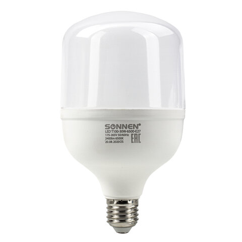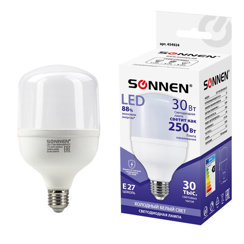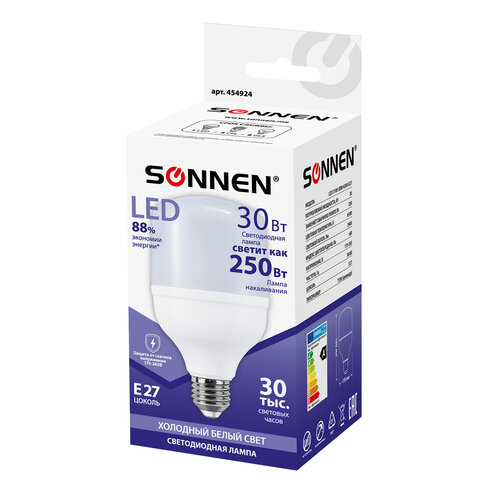 Светодиодная лампа SONNEN компактного размера. Срок службы лампы составляет не менее 30000 часов, что примерно в 30 раз больше, чем у обычной лампы накаливания.
