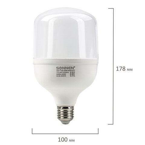 Оснащена цоколем типа Е27 и излучает холодный белый цвет. Отличается длительным сроком службы. Имеет цилиндрическую форму колбы и сделана из белого матового пластика. Мощность лампы составляет 30 Вт. Представленная модель дает световой поток 2400 Лм, а цветовая температура равна 6500 K. Диаметр лампы составляет 100 мм. Высота - 178 мм.