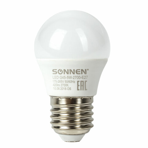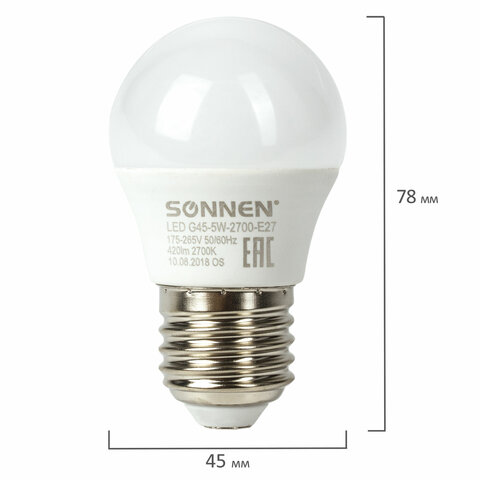 Оснащена цоколем типа Е27 и излучает теплый белый цвет. Отличается длительным сроком службы. Имеет шарообразную форму колбы и сделана из белого матового пластика. Мощность лампы составляет 5 Вт. Представленная модель дает световой поток 420 Лм нейтрального спектра, цветовая температура которого равна 2700 K. Диаметр лампы составляет 45 мм.