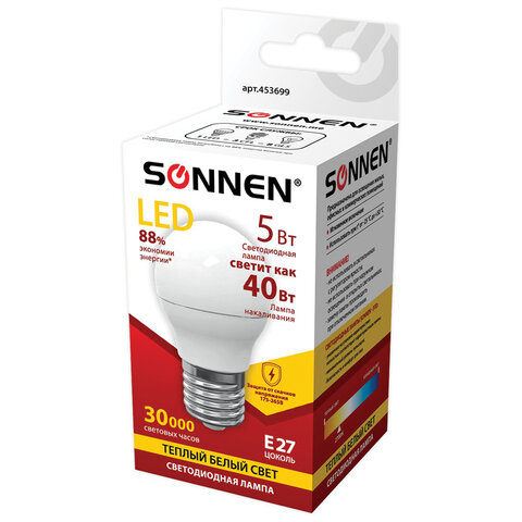 Светодиодная лампа SONNEN компактного размера. Срок службы лампы составляет не менее 30000 часов, что примерно в 30 раз больше, чем у обычной лампы накаливания.