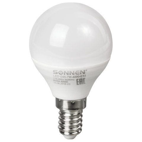 Оснащена цоколем типа E14 и излучает нейтральный белый цвет. Отличается длительным сроком службы. Имеет шарообразную форму колбы и сделана из белого матового пластика. Мощность лампы составляет 7 Вт. Представленная модель дает световой поток 600 Лм нейтрального спектра, цветовая температура которого равна 4000 K. Диаметр лампы составляет 45 мм.
