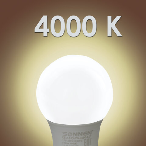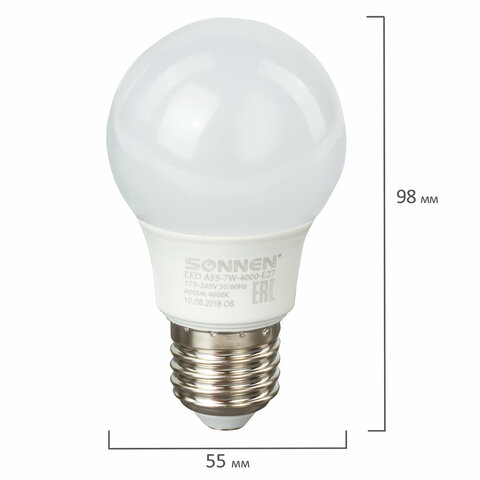Оснащена цоколем типа Е27 и излучает нейтральный белый цвет. Отличается длительным сроком службы. Имеет грушевидную форму колбы и сделана из белого матового пластика. Мощность лампы составляет 7 Вт. Представленная модель дает световой поток 600 Лм нейтрального спектра, цветовая температура которого равна 4000 K. Диаметр лампы составляет 55 мм.
