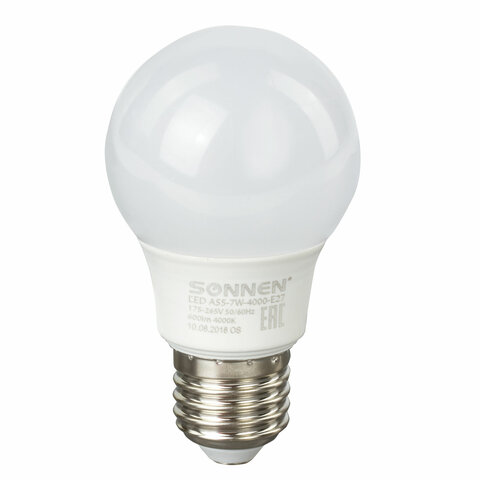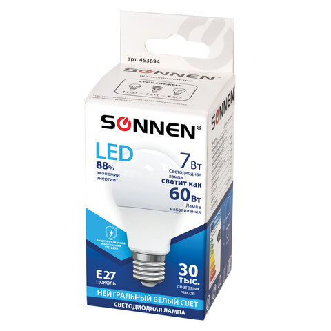 Светодиодная лампа SONNEN компактного размера. Срок службы лампы составляет не менее 30000 часов, что примерно в 30 раз больше, чем у обычной лампы накаливания.