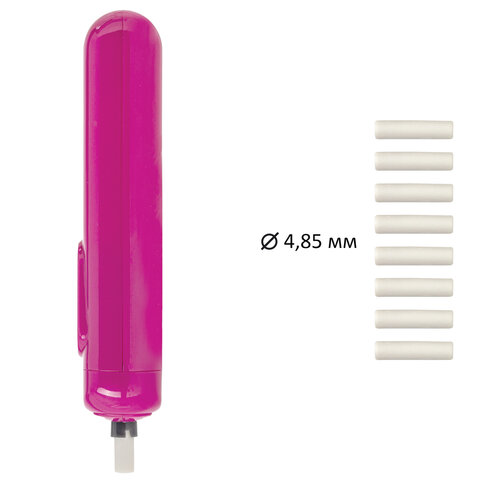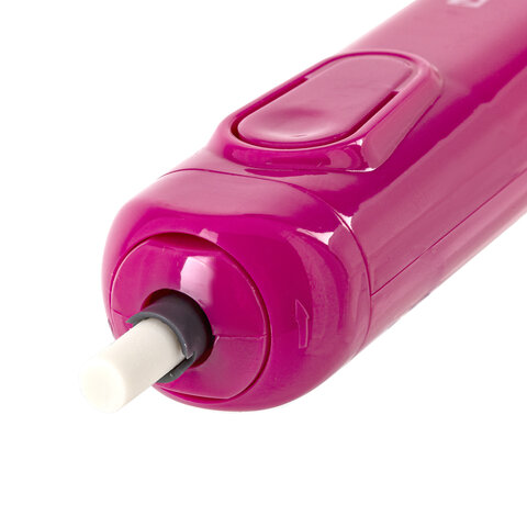 Электрический ластик работает от 2 батареек ААА (в комплект не входят). При помощи мощного внутреннего мотора насадка-ластик приходит в движение и позволяет очень точно корректировать эскиз или чертеж, создавать блики на карандашных рисунках. В комплект входят 8 дополнительных ластиков-насадок размером 4,85х15 мм. Цвет корпуса - розовый. Упаковка - блистер с подвесом.