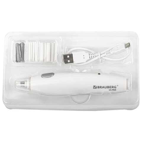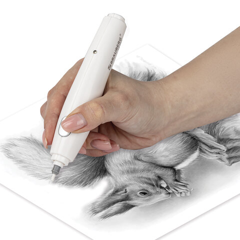 Работает от встроенного аккумулятора, USB-провод для зарядки входит в комплект. При помощи мощного внутреннего мотора насадка-ластик приходит в движение и позволяет очень точно корректировать эскиз или чертеж, создавать блики на карандашных рисунках. В комплект входят 8 дополнительных ластиков-насадок размером 5х25 мм, 8 ластиков-насадок размером 2,3х25 мм и два пластиковых держателя для них.