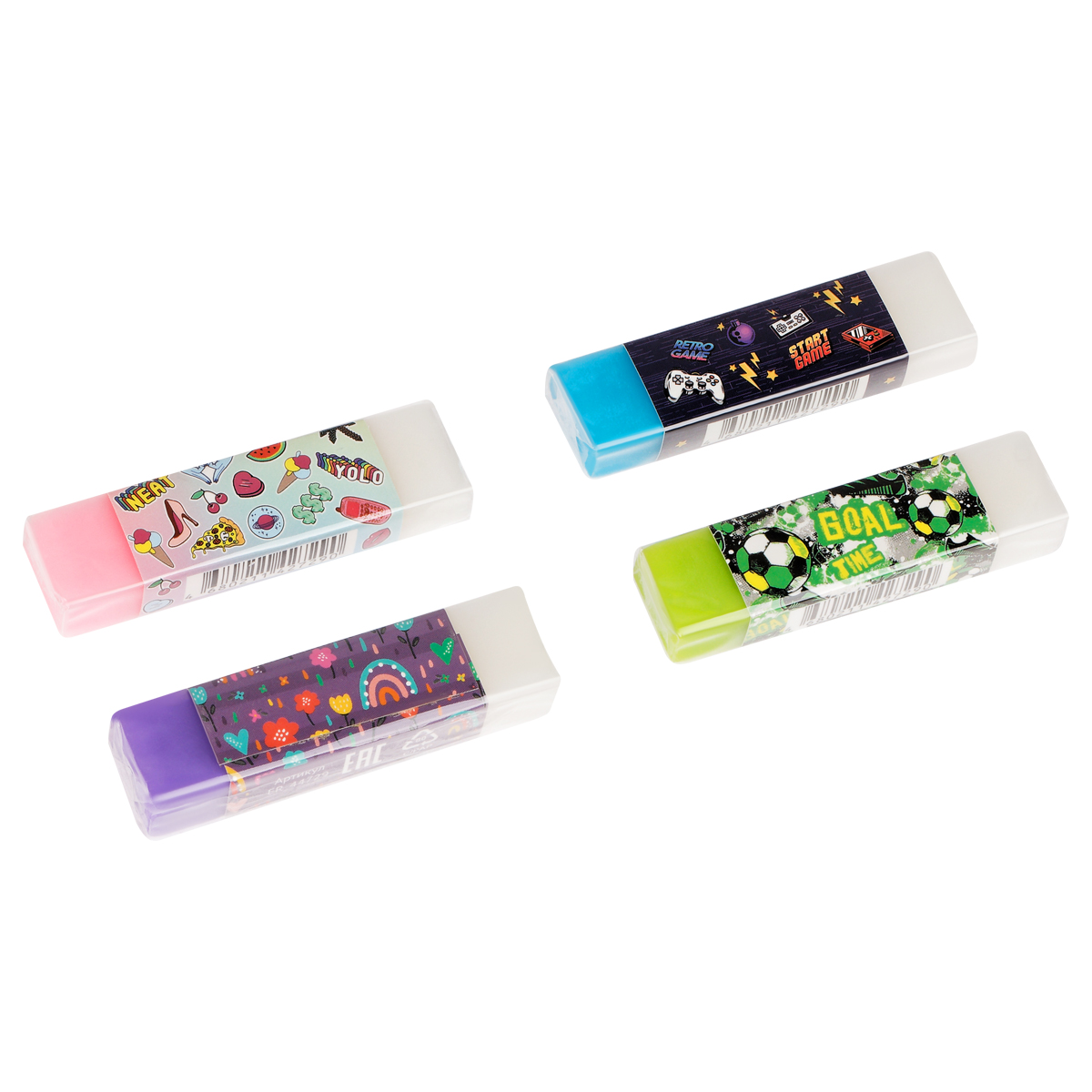 Ластик ArtSpace Have Fun размера 60*15*10 мм выполнен из термопластичной резины. Изделие удобной формы прекрасно справляется с линиями от чернографитного карандаша. Двухцветные ластики в яркой обёртке поставляются в красочном дисплей-боксе. У каждого изделия есть штрих-код. В ассортименте представлено 4 цвета ассорти.