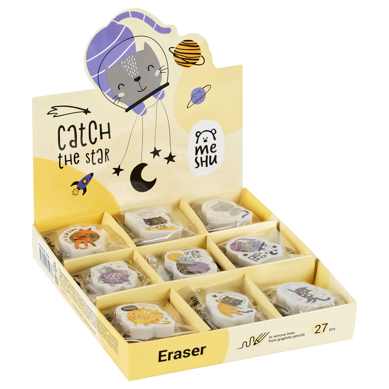Ластик MESHU Space Cat – яркий и забавный помощник в школе, офисе и дома. Ластики фигурной формы выполнены из высококачественной термопластичной резины. Представлено ассорти из 9 веселых дизайнов ластика белого цвета с рисунком милых котиков. Размер – 40*30*13 мм. Отлично стирает чернографитный карандаш. Ластики представлены в дисплей-боксе, каждый упакован в отдельный пакет.<br/><br/>• Размер: 40*30*13 мм;<br/>• Материал: термопластичная резина