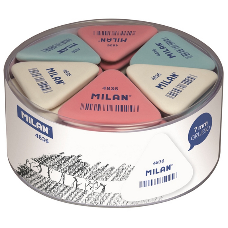 Гибкий каучуковый треугольный ластик Milan 4836. Может использоваться для стирания графитных карандашей со всех типов бумаги. Цвета в ассортименте: белый, розовый, синий (без возможности выбора). Размер ластика: 5×4.4×0.7 см.