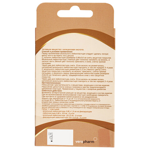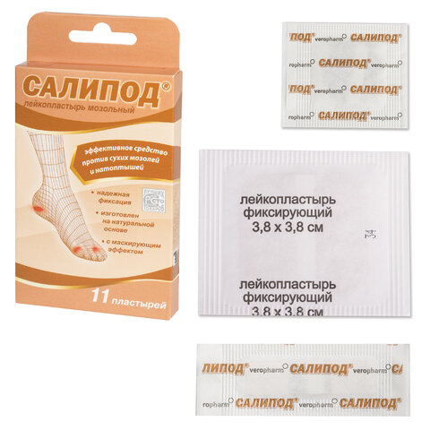Салициловый лейкопластырь для лечения сухих мозолей и натоптышей, в современной упаковке в виде набора: 11 пластырей 3 размеров.