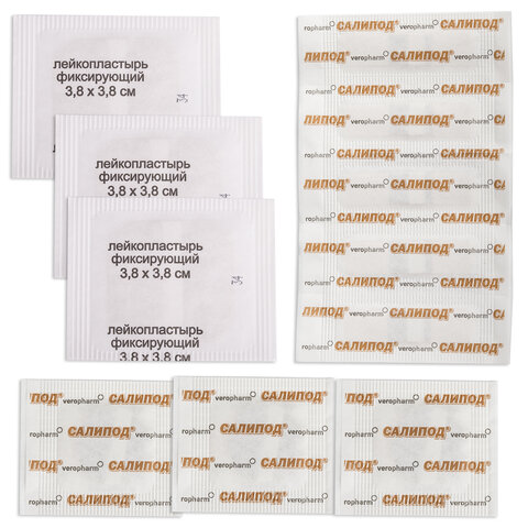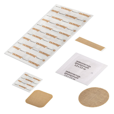 - разнообразие размеров: пластыри 0,95 х 3,8 с салициловым тампоном – 5 шт., круглый салициловый пластырь диаметром 2,3 см – 3 шт., фиксирующий пластырь 3,8 х 3,8 – 3 шт.