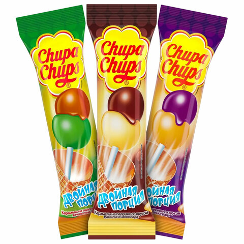 Карамель CHUPA CHUPS двойная порция - два шарика карамели на одной палочке. Ассорти вкусов: ваниль-шоколад, манго-виноград, апельсин-дыня.