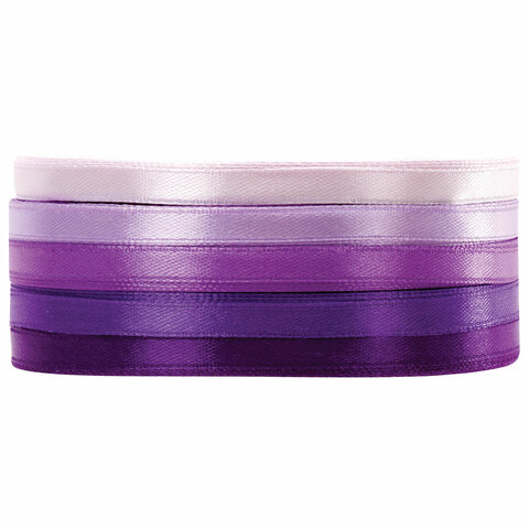 Изделие представляет собой набор из атласных лент, изготовленных из 100% полиэстера, с ткаными кромками на обоих краях. Кромка на краях лент выполнена с применением полиэстеровой нити. Ленты изготовлены с применением саржевого способа переплетения нитей. В набор входит 5 лент фиолетовых оттенков от светло-сиреневого до насыщенного фиолетового цвета шириной 6 мм (± 3%) и длиной 23 м. Каждая лента намотана на втулку из пенополистирола. Набор лент упакован в термоусадочную пленку, содержащую этикетку с краткой информацией о товаре.
