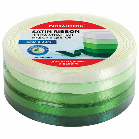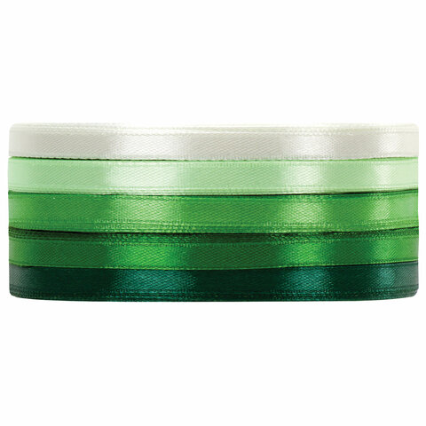 Изделие представляет собой набор из атласных лент, изготовленных из 100% полиэстера, с ткаными кромками на обоих краях. Кромка на краях лент выполнена с применением полиэстеровой нити. Ленты изготовлены с применением саржевого способа переплетения нитей. В набор входит 5 лент зеленых оттенков от светло-зеленого до насыщенного зеленого цвета шириной 6 мм (± 3%) и длиной 23 м. Каждая лента намотана на втулку из пенополистирола. Набор лент упакован в термоусадочную пленку, содержащую этикетку с краткой информацией о товаре.