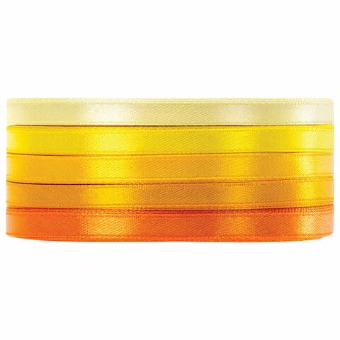Изделие представляет собой набор из атласных лент, изготовленных из 100% полиэстера, с ткаными кромками на обоих краях. Кромка на краях лент выполнена с применением полиэстеровой нити. Ленты изготовлены с применением саржевого способа переплетения нитей. В набор входит 5 лент желтых и оранжевых оттенков от светло-желтого до насыщенного оранжевого цвета шириной 6 мм (± 3%) и длиной 23 м. Каждая лента намотана на втулку из пенополистирола. Набор лент упакован в термоусадочную пленку, содержащую этикетку с краткой информацией о товаре.