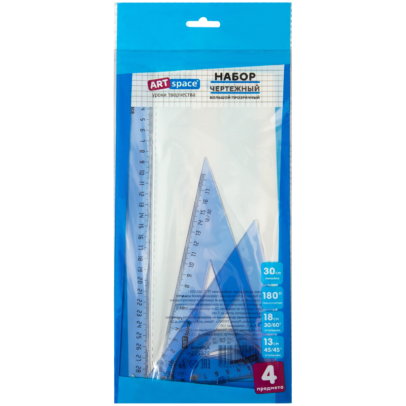 Набор чертёжный большой ArtSpace цветной прозрачный. В него входят: линейка пластиковая 30 cм, треугольник пластиковый 30°-60 °, 18 см, треугольник пластиковый 45°-45 °, 13 см, линейка-транспортир пластиковая 180 ° . Пакет с европодвесом.