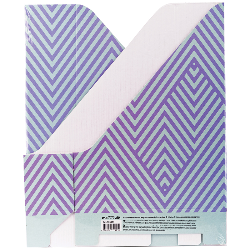 Накопитель-лоток вертикальный MESHU "Lavander & Mint".<br/>Актуальный привлекательный дизайн, одинаково подойдет как для офисного, так и для домашнего интерьера. Накопитель лоток MESHU "Lavander & Mint" предназначен для хранения бумаг, документов, брошюр, каталогов. Изготовлен из кашированного микрогофрокартона, покрытого матовой ламинацией. Легко складывается. Возможно многократное сложение/разложение. Размер лотка в собранном виде - 305*230*75 мм.