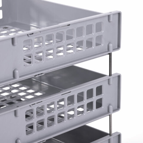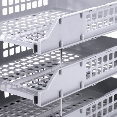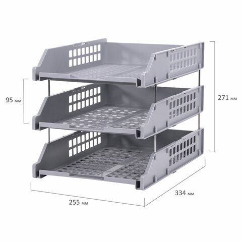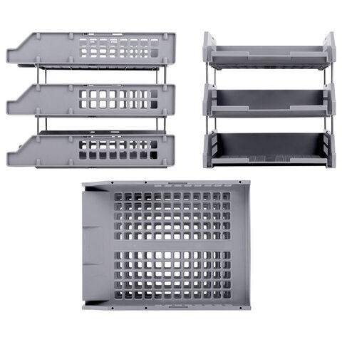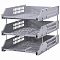 Изготовлены из прочного полистирола. Размер лотков в собранном виде - 334х255х240 мм. Комплект из 3 лотков обладает устойчивой конструкцией, благодаря которой удобен для хранения объемных документов и папок. Выполнены в сером цвете.